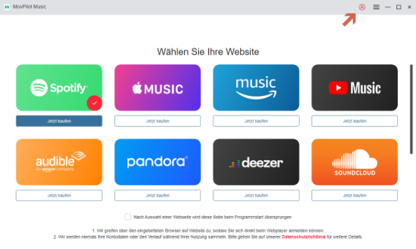 - Installieren Sie MovPilot Music auf Ihrem Gerät und öffnen Sie das Registrierungsfenster über das Benutzer-Icon in der oberen rechten Ecke. (MovPilot Music lässt sich auch vorab ohne Anmeldung