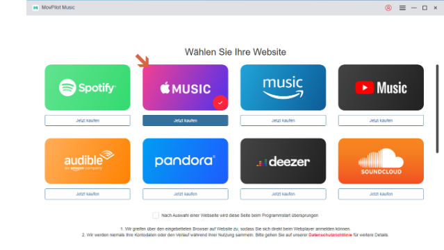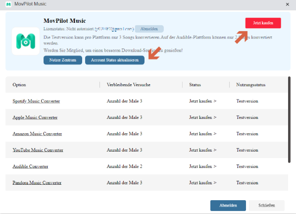 - Probieren Sie MovPilot Music zunächst aus. Wenn Sie die Vollversion möchten, klicken Sie auf „Jetzt kaufen“.